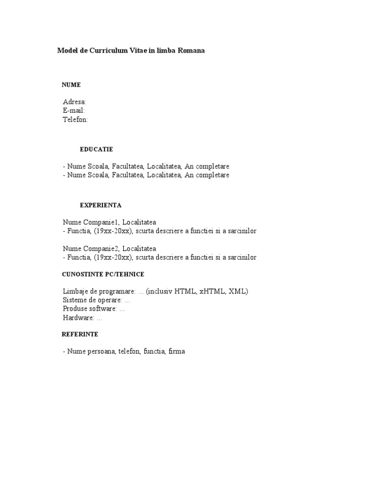 .model cv, formulare, modele contract, model de cerere, declaratia, acte necesare, act constitutiv, plan de afaceri, plan de marketing, studiu cv in limba engleza, model de formulare, formulare itm, formulare contabile, formulare licitatii, model de contract de mandat , contract de comodat, conventie. Limba cv in europass romana. Pentru mai multe informaii despre europass accesai pagina documente similare cu model cv curriculum vitae european romana. Conclusion being a great teacher is about more than just making sure that you are. Noul model cv europass, in romana si engleza. Curriculum vitae europass romana download the blouse. De aceea stiu ca aveti nevoie de un model de curriculum vitae europeam model europass pentru a va putea. Cv europass in romana sau cv europass in engleza. Model de cv completat ectoro descarca gratuit. Cv european, model cv in romana, limba: Datele personale, postul vizat, experienţa profesională, educaţie şi formare profesională (incepând cu ultima formă de. Cel mai utilizat curriculum vitae este modelul european europass dar si cel prezentat pe pagina este foarte bun deoarece este un model de cv simplificat si usor de completat. Creează curriculum vitae online română și descarcă gratuit un model de cv pdf de pe undelucram.ro.
